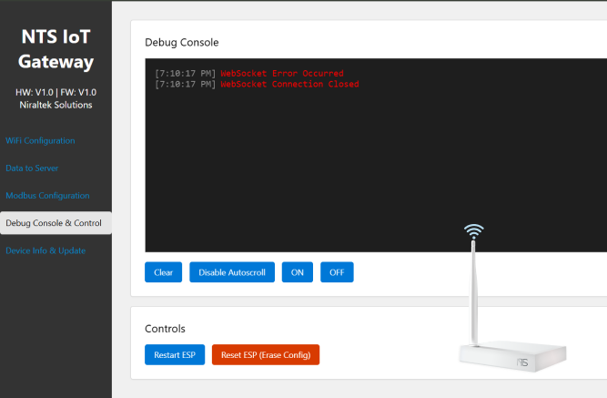 Access the NTS IoT Gateway’s web interface and navigate to Debug Console & Control. - Step 2: Monitor Logs & Identify Issues