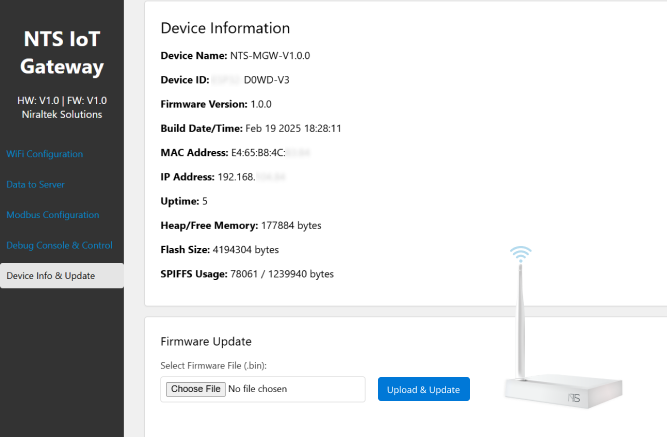 Navigate to Device Info & Update to view firmware version, memory usage, and system details. - Step 2: Upload Firmware Update