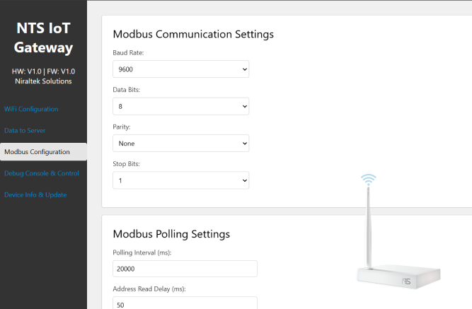 Open the NTS IoT Gateway’s web interface and navigate to Modbus Configuration. - Step 2: Set Communication Parameters